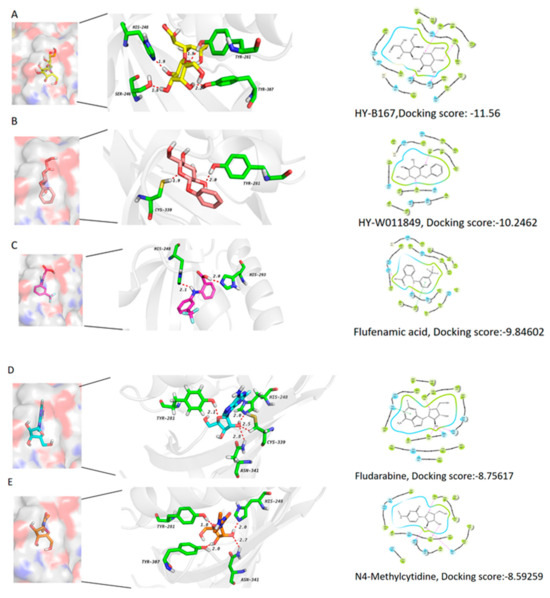 After the molecular feature extraction of the deep learning algorithm DMPNN + XGBoost and its molecular docking prediction and docking scores of the target protein “EPAS1”, the five compounds with the top-ranked docking scores were selected. Compound 1, HY-B1673, an endogenous metabolite, can form four hydrogen bonds with the EPAS1 protein, where three hydroxyl groups in its pyranoid ring form a hydrogen bond with HIS248/SER246/TYR307, respectively (Figure 8A). Compound 2, phenyl -D-glucopyranoside, with anticancer and anti-inflammatory activities, can inhibit the production of nitric oxide, the expression of COX-2, and the nuclear translocation of NF-kB [58]. It can form two hydrogen bonds with EPAS1, with TYR-281 and CYS-339, respectively (Figure 8B). Compound 3 and compound 4 are two FDA-approved drugs, flufenamic acid and fludarabine, respectively. Flufenamic acid is a non-steroidal anti-inflammatory agent which can inhibit the activity of COX, regulate ion channels, and block the chloride and L-type Ca2+ channels. Furthermore, flufenamic acid can inhibit TEAD function and TEad-YAP-dependent processes such as cell migration and proliferation [59,60]. Moreover, fludarabine (F-ara-A; NSC 118218) is a DNA synthesis inhibitor and a fluorinated purine analogue with antitumor activity towards lymphoproliferative malignancies, which can inhibit the activation of STAT1 and STAT1-dependent gene transcription induced by cytokines. There have been more than thirty studies of fludarabine over the past few years [61,62]. The docking models in Figure 8C,D demonstrate that these two drugs can target the TF EPAS1. Besides their hydrogen bonding ability, they can also generate interactions. The last compound is a cytosine nucleoside analogue, which has mechanisms to inhibit DNA methyltransferase (e.g., zebularine) and potential antimetabolic and antitumor activities [63]. It also has a comparatively stable binding pocket with the protein EPAS1 through more than four potential hydrogen bonds (Figure 8E). Studies have demonstrated that EPAS1 is regulated by DNA methyltransferases (DNMTs) in non-small cell lung cancer (NSCLC) [64].