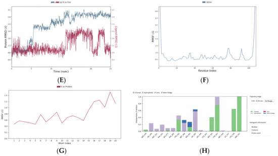 Molecular dynamics simulation results of FDA drugs flufenamic acid and fludarabine. (A–D) Flufenamic acid: root mean square deviation curve (RSMD), root mean square wave curve (RMSF), small molecule root mean square wave curve (RMSF), and statistics of interaction proportion of different residues. (E–H): The same metrics as above, but for fludarabine.