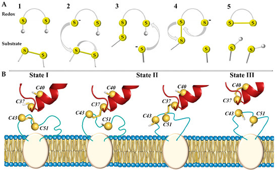 In total, three types of biochemical reactions are responsible for chemical transformations between the functional groups of such proteins: nucleophilic substitution–elimination, specifically so-called thiol–disulphide exchange (TDSE) reactions, two-electron reactions of thiols or disulphide bonds, as well as radical reactions [8]. These reactions promote the transformations of the disulphide bond (–S-S–), thiol (–SH), and thiolate anion (–S–) and therefore play a central role in the oxidative folding of proteins and are a key mechanism in almost all enzymes that form and isomerise disulphide bonds [9]. During these reactions, one of the thiol groups of the redox protein is deprotonated and carries out a nucleophilic attack on the substrate (target) disulphide bond, forming a mixed disulphide intermediate (Figure 1A). Another thiol group releases the reduced substrate (target), leaving behind the oxidised enzyme.