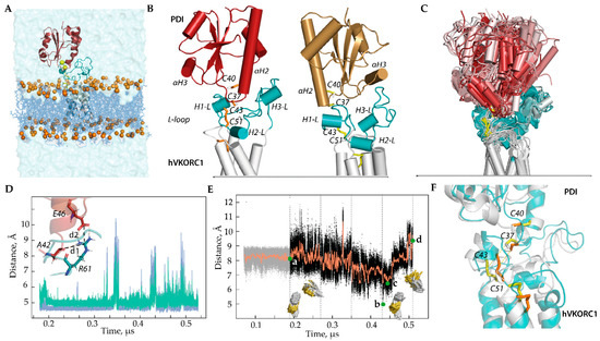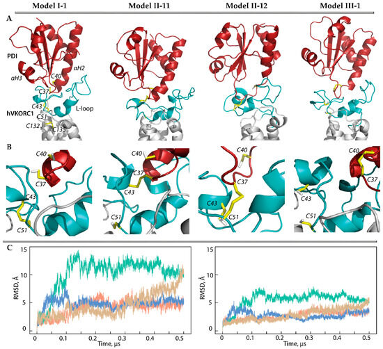 All constructed 3D models were inserted into the membrane (Figure 2A) and explored by conventional MD simulations (all atoms, explicit water, trajectory of 0.52 μs). During the first step (0–0.18 µs), each model was simulated using the constraints for the S⋯S inter-protein distance, which were further relaxed. The MD conformations of each model were normalised by least-squares fitting to the reference structure (the conformations taken at t = 0.18 μs), to avoid the motion of the protein as a rigid body. To compare models, we used the same protocol and criteria for all PDI-hVKORC1 complex constructions, their MD simulation, and the analysis of generated data as described in [16].