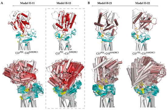 Since C37 is the most exposed residue of the PDI motif CGHC, its thiol group can interact with either C41 or C53 of hVKORC1 to form a ‘mixed’ inter-protein –S-S– bond. Therefore, the ‘intermediate’ complex (state II) was modelled considering these two possible modes of covalent binding. First, a pair of ‘intermediate’ covalent complex models was derived from the precursor complex, Model I-1, labelled as Model II-11 and Model II-12 (Figure 3).