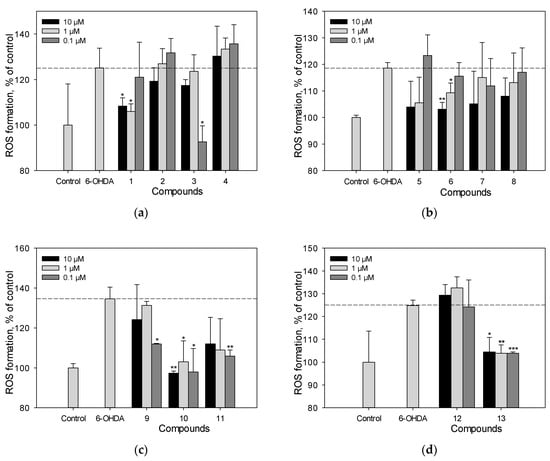 4.7. Reactive Oxygen Species (ROS) Analysis in 6-OHDA- and PQ-Treated Cells