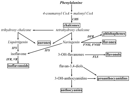 Major branches of the flavonoid biosynthesis pathway. Some of the critical enzymes are abbreviated as follows: CHS, chalcone synthase; DFR, dihydroflavonol 4-reductase; FSI/II, flavone synthase I/II; FLS, flavonol synthase; IFS, isoflavone synthase; IFR, isoflavone reductase; LCR, leucoanthocyanidin reductase; VR, vestitone reductase. Major classes of end-products are emphasized in boxes. This figure was adapted from Ref. [14].
