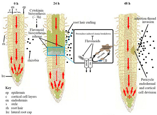 A schematic model of the regulation of auxin transport during nodulation in Medicago truncatula. Before rhizobia infection, auxin is transported in the acropetal direction towards the root tip. Auxin is also transported in the basipetal direction (from root tip to elongation zone) in the outer layer(s). Within 3 h after symbiosis induction (lipochitooligosaccharide treatment), cytokinin biosynthesis is upregulated in the M. truncatula roots [61]. Cytokinin perception at the inner cortex induces/releases certain flavonoids, which act as inhibitors of acropetal auxin transport at the inner cortical, endodermal and/or pericycle directly underlying the rhizobia infection site [62]. Flavonoids are auxin transport inhibitors that are thought to disrupt the complex between ABCB1 (ATP-Binding Cassette Subfamily B 1) and TWD1 (TWISTED DWARF1) [63,64], affecting transport, and by binding BIG, a protein required for PIN cycling [65]. The reduction in acropetal auxin transport increases the auxin concentration at the rhizobia infection site, the location of a future nodule primordium. An increase in basipetal auxin transport could also contribute to an increased auxin pool at the nodulation site [62]. Pericycle, endodermal and cortical cell divisions are activated within 48 h. The red arrow shows the polar auxin transport, and the arrow thickness is proportional to the auxin transport capacity. The green color shows the auxin gradient, and the darker color denotes a higher auxin content. This figure was adapted from Ref. [66].