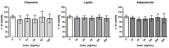 Viability of BME-UV1 bovine mammary epithelial cells treated for 24 h with different concentrations of chemerin, leptin, or adiponectin. Graphs present cell viability measured using the MTT assay. The viability of untreated control cells (0) was designated as 100%. Results are presented as means ± standard deviation of three independent experiments.