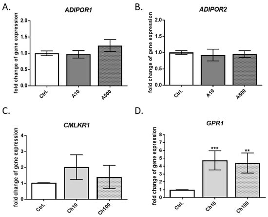 To confirm the expression of leptin, adiponectin, and chemerin receptors in BME-UV1 cells, we used reverse transcription-quantitative PCR (RT-qPCR). The expression of genes encoding: adiponectin receptors ADIPOR1 and ADIPOR2, chemerin receptors CMLKR1, CCRL2, and GPR1, and leptin receptor OB-R was analyzed in untreated control cells and in bovine MECs treated for 24 h with low and high doses of adiponectin (10, 500 ng/mL), chemerin (10, 100 ng/mL), or leptin (10, 100 ng/mL). Transcripts of both adiponectin receptors, ADIPOR1 and ADIPOR2, were detected in BME-UV1 cells. The addition of adiponectin did not significantly affect the expression of either gene, regardless of the administered dose (Figure 2A,B).