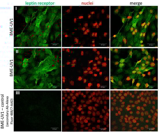 For the purpose of immunofluorescence staining, the BME-UV1 cells were cultured on chamber slides (Nunc Lab-Tek Chamber Slide System, Thermo Fisher Scientific) in monolayer or 3D cultures on Matrigel. In the case of monolayer culture, cells were grown until 80% confluence and fixed with 3.7% paraformaldehyde (Sigma-Aldrich, Merck) for 15 min at room temperature (RT). In the case of 3D cultures, cells were grown for 11 days on chamber slides covered with Matrigel, following fixation with paraformaldehyde. Next, the cells were permeabilized with 0.5% Triton X-100 diluted with PBS (Sigma-Aldrich, Merck) for 10 min at RT, washed three times in PBS, blocked with 5% normal goat serum for 1 h, and incubated overnight with primary antibodies against leptin receptor (Bioss Antibodies, Woburn, MA, USA) or β1-integrin (Novus Biologicals, Littleton, CO, USA). Detailed information about the antibodies used in this study is presented in Table 2. After overnight incubation with primary antibodies, the cells were washed three times in PBS and incubated with Alexa Fluor 488-conjugated secondary antibodies for 1 h in darkness at RT. In the case of 3D cultures, the cells were also co-incubated with Alexa Fluor 594 Phalloidin, detecting F-actin (cat, no: A12381) (Invitrogen, Thermo Fisher Scientific). Next, the cells were washed three times in PBS, and nuclei were counterstained with 7-amino actinomycin (7-AAD, 5 μg/mL) for 20 min at RT, or Hoechst 33342 (1 μg/mL) for 10 min at RT in darkness. The cells were visualized using a confocal laser scanning microscope FV-500 system (Olympus Optical Co., Hamburg, Germany). In the case of monolayer culture, at least 12 different fields of view (60× objective) were captured per experimental condition. In the case of 3D cultures, images of 5–10 spheroidal structures from each well were taken, and the analysis was performed in three replicates. The diameters of 3D structures formed by the BME-UV1 cells were measured using ImageJ software (https://ij.imjoy.io accessed on 2 April 2024) (National Institutes of Health and the Laboratory for Optical and Computational Instrumentation, University of Wisconsin). The diameters of at least 14 spheroidal structures were measured per experimental condition.