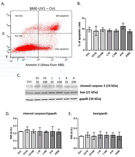Evaluation of apoptosis in BME-UV1 bovine mammary epithelial cells treated with chemerin (Ch10 = 10 ng/mL, Ch100 = 100 ng/mL), leptin (L10 = 10 ng/mL, L100 = 100 ng/mL), or adiponectin (A10 = 10 ng/mL, A500 = 500 ng/mL) for 24 h. (A) Representative dot-plots of Annexin V/PI double staining in untreated control cells; (B) graph showing percentage of apoptotic cells (sum of Annexin Vpos/PIneg and Annexin Vpos/Pipos cells) in control and adipokine-treated cells; (C) representative images of Western blot (WB) analysis of apoptotic markers cleaved caspase 3 and bax, where gapdh was used as a reference protein; (D,E) graphs showing the results of the densitometric analysis of WB images; the integrated optical density (IOD) of cleaved caspase 3 and bax bands was normalized to the IOD of gapdh bands. Results are presented as means ± standard deviation of three or four independent experiments.