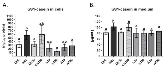 Concentration of αS1-casein in BME-UV1 cells (A) and media (B) collected after 24 h of culture. Cell were treated with chemerin (Ch10 = 10 ng/mL, Ch100 = 100 ng/mL), leptin (L10 = 10 ng/mL, L100 = 100 ng/mL) or adiponectin (A10 = 10 ng/mL, A500 = 500 ng/mL). Untreated cells were used as a negative control, whereas cells exposed for 24 h to the lactogenic hormone prolactin (PRL, 1 µg/mL) were used as a positive control. Results are presented as means ± standard deviation of three independent experiments. Means followed by a common letter are not significantly different according to one-way ANOVA with Tukey’s multiple comparison post-test, at the 5% level of significance (p < 0.05).