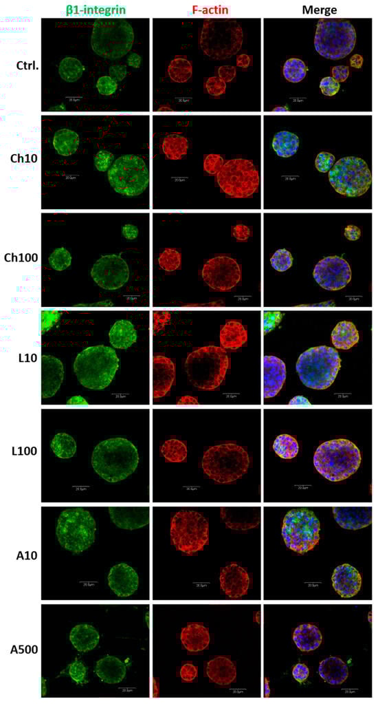 Panels of confocal micrographs presenting the immunofluorescence staining of BME-UV1 cells cultured on Matrigel for 11 days in control growth medium (Ctrl.) or medium supplemented with chemerin (Ch10 = 10 ng/mL, Ch100 = 100 ng/mL), leptin (L10 = 10 ng/mL, L100 = 100 ng/mL), or adiponectin (A10 = 10 ng/mL, A500 = 500 ng/mL). Cells were stained with primary antibodies against β1-integrin and secondary antibodies conjugated with Alexa Fluor 488 dye (green fluorescence); Alexa Fluor 594 phalloidin, detecting F-actin (red fluorescence), and nuclei counterstained with Hoechst 33342 (blue fluorescence). Images were taken at 600× magnification and are representative for three independent experiments. Scale bar: 20 μm.