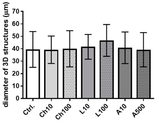 Diameters of 3D mammospheres formed by BME-UV1 cells cultured on Matrigel for 11 days. Cells were cultured in control growth medium (Ctrl.) or medium supplemented with chemerin (Ch10 = 10 ng/mL, Ch100 = 100 ng/mL), leptin (L10 = 10 ng/mL, L100 = 100 ng/mL), or adiponectin (A10 = 10 ng/mL, A500 = 500 ng/mL). The diameters of cross sections of the spheroids were measured using ImageJ software (https://ij.imjoy.io accessed on 2 April 2024). Results are presented as means ± standard deviation of at least 14 spheroids per experimental condition photographed using a confocal microscope equipped with a digital camera.