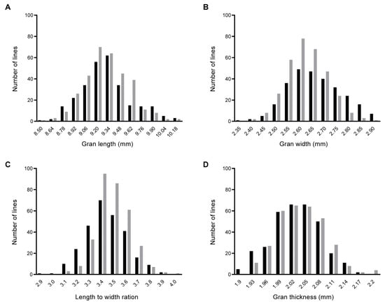 Frequency distributions of GL (A), GW (B), LWR (C), and GT (D) in the BC1F2 and BC1F2:3 populations. The vertical axis represents the number of BC1F2 and BC1F2:3 plants, with black and gray bars, respectively.