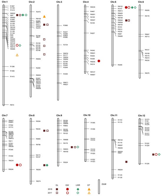 Genetic linkage map of grain-size-related QTLs detected in the BC1F2 and BC1F2:3 populations.