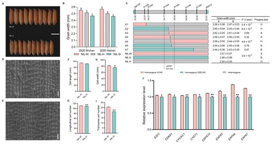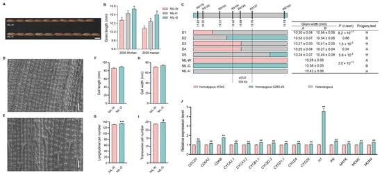 Grain size is restricted by the spikelet hull, which is determined by cell division and expansion []. We conducted scanning electron microscopic (SEM) analysis to uncover the cytological basis underlying the regulation of grain size in qGW1. The values of cell width and the number of transverse cells were higher in NIL-WqGW1 than in NIL-GqGW1 (Figure 3D–I). Furthermore, we examined the expression of cell cycle and cell expansion genes in young panicles of NILs using qRT-PCR. Our findings indicated that four cell cycle related-genes (E2F2, CDKA1, CYCA3;1, and CYCT1), as well as four cell expansion related-genes (EXPA10, EXPA5, EXPA6, and EXPA7), were up-regulated in NIL-WqGW1, suggesting that qGW1 regulates grain width by promoting both cell division and cell expansion (Figure 3J and Figure 9).