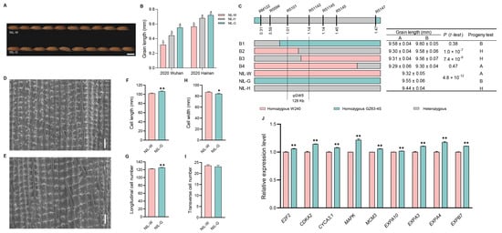 Analysis of qGL9 influence grain length. (A) Grain morphology. Scale bar: 5 mm. (B) Grain length difference among three haplotypes in 2020. (C) Fine mapping of qGL9. The numbers below the bar are physical distance (Mb). (D,E) Scanning electron microscopy of the outer epidermal cells of NIL-WqGL9 and NIL-GqGL9. Scale bar: 100 µm. (F) Cell length. (G) Total number of longitudinal cells. (H) Cell width. (I) Total number of transverse cells. (n = 10). (J) qRT-PCR analysis of fifteen cell cycle related-genes between NILs of qGL9. Data are represented as mean ± s.e.m. (n = 9). Duncan’s multiple range tests were used to conduct statistical analysis (a, b and c indicate p < 0.01). The student’s t-test was used to produce p values (*, ** indicate significance at p < 0.05 and p < 0.01, respectively).