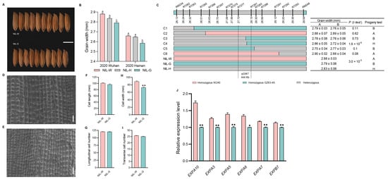 The NIL-WqGW7 spikelet hull had a wider cell size than NIL-GqGW7, while no difference was observed in cell number (Figure 5D–I). We further observed an up-regulation in the expression of six cell expansion related-genes (EXPA10, EXPA3, EXPA5, EXPA6, EXPA7 and EXPB7) in NIL-WqGW7, indicating that qGW7 regulates grain width through the alteration of cell expansion (Figure 5J and Figure 9).