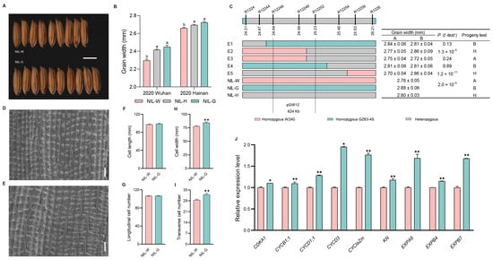 Analysis of qGW12 influence grain width. (A) Grain morphology. Scale bar: 5 mm. (B) Grain width difference among three haplotypes in 2020. (C) Fine mapping of qGW12. The numbers below the bar are physical distance (Mb). (D,E) Scanning electron microscopy of the outer epidermal cells of NIL-WqGW12 and NIL-GqGW12. Scale bar: 100 µm. (F) Cell length. (G) Total number of longitudinal cells. (H) Cell width. (I) Total number of transverse cells. (n = 10). (J) qRT-PCR analysis of six cell cycle related-genes and three cell expansion related-genes between NILs of qGW12. Data are represented as mean ± s.e.m. (n = 9). Duncan’s multiple range tests were used to conduct statistical analysis (a and b indicate p < 0.01). The student’s t-test was used to produce p values (*, ** indicate significance at p < 0.05 and p < 0.01, respectively).