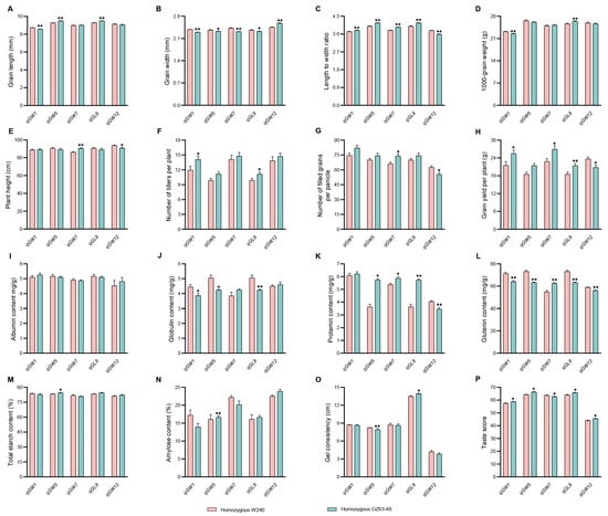 Phenotypes of rice yield and quality comparison among qGW1, qGW5, qGW7, qGL9, and qGW12 identified in this study. (A–H) Grain length, grain width, length to width ratio, 1000-grain weight, plant height, number of tillers per plant, number of filled grains per panicle, and grain yield per plant in five NILs. (n = 12). (I–P) Albumin content, globulin content, prolamin content, glutenin content, total starch content, amylose content, gel consistency, and taste score. (n = 6). All phenotypic data in (A–P) were measured from paddy-grown NIL plants grown under normal cultivation conditions. Data are represented as mean ± s.e.m. The student’s t-test was used to produce p values (*, ** indicate significance at p < 0.05 and p < 0.01, respectively).