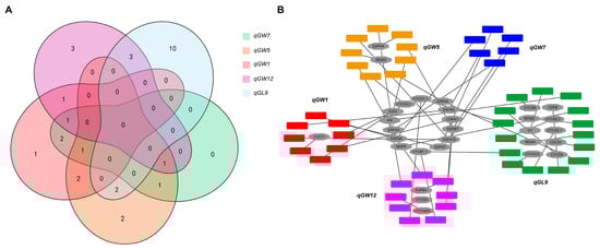 To elucidate the characterization and commonality of differentially expressed genes influencing cell number and size in qGW1, qGW5, qGW7, qGL9, and qGW12, we analyzed the association among these genes involved in cell division and expansion. Specifically, we identified one specific differential gene in qGW1, two in qGW5, ten in qGL9, and three in qGW12. The regulatory modules of qGW1-qGW5, qGW1-qGW12, qGW5-qGL9, and qGL9-qGW12 exhibited differential expression in cell cycle-related genes, including E2F2 and CYCA3;1; CDKA1; MAPK and CDKA2; and CYCD1;1, CYCB1;1, and KN, respectively (Figure 9A,B). These findings suggest that the regulation of grain width by qGW1 and qGW12 is mediated through the modulation of CDKA1, while the influence of qGW5 and qGL9 on grain length involves MAPK- and CDKA2-mediated mechanisms, thereby altering cell numbers. Moreover, the differential expression of cell expansion-related genes, such as EXPA5, EXPA10, EXPA6 and EXPA7; EXPA3, EXPA10, and EXPB7; EXPA10; and EXPA6 and EXPB7, were observed within the regulatory modules of qGW1-qGW7, qGW5-qGW7, qGW1-qGW5-qGW7, qGW1-qGW7-qGW12, and qGW5-qGW7-qGW12, respectively (Figure 9A,B), suggesting qGW1-qGW7-qGW12 influences cell size and grain width by altering the expression of EXPA6. Numerous QTLs and genes have been reported to regulate grain size by influencing the expression of cell division and expansion-related genes, such as qTGW2b [], GLW7.1 [], GL3.1 [], and GS2 []. In addition, negative correlations were observed between gene expression and grain yield for both qGW1 and qGW7. Despite variations in the expression of cell cycle- and expansion-related genes, there was no alteration in the yield of qGW5. Notably, positive correlations were observed between gene expression and grain yield for both qGL9 and qGW12. Variations in the expression of genes associated with cell division and expansion not only impact grain size, but also influence grain yield [,,].