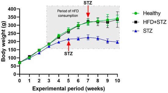 Body weight increased gradually in both models, although in HFD + STZ animals, the body weight was higher than in STZ animals (Figure 1). After STZ administration in the STZ model, a negative impact on the body weight gain was observed.