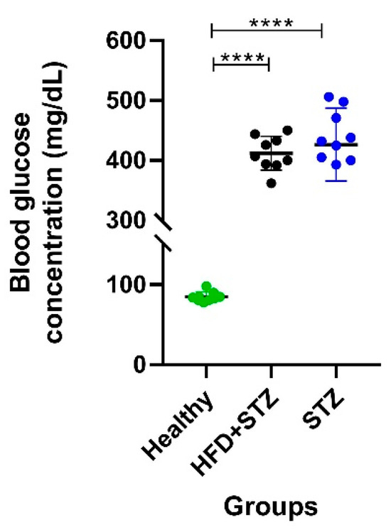 As shown in Figure 2, the HFD + STZ model revealed homogeneous post-induction blood glucose levels (within a range of 350 to 450 mg/dL, and a mean of 412.0 ± 9.5 mg/dL) and a maximum difference of 100 mg/dL between the lowest and the highest blood glucose concentration. On the other hand, in the STZ model, we found glucose concentration values with a greater dispersion, ranging from 270 to 510 mg/dL, with a mean of 426.3 ± 19.2 mg/dL. The latest results exhibit a wide range of glucose concentration values, approximately 250 mg/dL, representing a glucose difference of two and a half times higher than that found in the HFD + STZ model (Figure 2).
