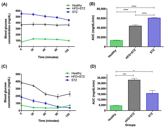 Glucose homeostasis assessment of all experimental groups. (A) Oral glucose tolerance test (OGTT), (B) area under the curve of OGTT, (C) insulin tolerance test (ITT), and (D) area under the curve of ITT (mean ± SEM). HFD + STZ: high-fat diet plus streptozotocin group, STZ: streptozotocin group, n = 9 animals per experimental group. * p < 0.05, *** p < 0.001, **** p < 0.0001.