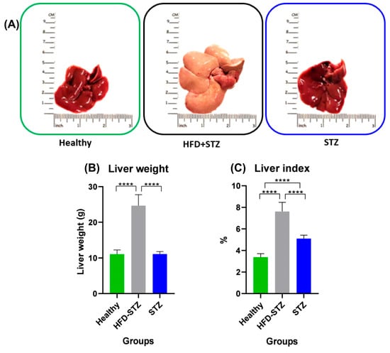 Analysis of the macroscopic characteristics of the liver in all experimental groups. (A) Representative images of the liver from all experimental groups. (B) Liver weight (g) and (C) liver index (%) of the healthy group as well as the HFD + STZ and STZ groups. HFD + STZ: high-fat diet plus streptozotocin, STZ: streptozotocin, n = 9 animals per experimental group. **** p < 0.0001.