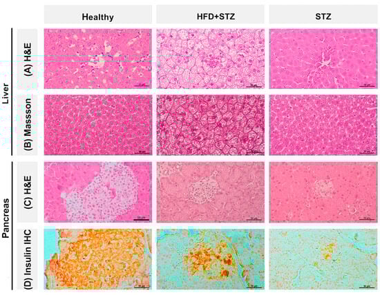Histopathological changes in hepatic and pancreatic tissues from all experimental groups. Representative photomicrographs of liver tissue stained with (A) hematoxylin and eosin (H&E, 40×) and (B) Masson’s trichome (40×). Representative photomicrographs of pancreatic tissue stained with (C) hematoxylin and eosin (H&E, 40×) and (D) insulin immunoreactive pancreatic islet cells (40×): Healthy group, 80% insulin-positive cells; HFD + STZ group, 40% insulin-positive cells; and STZ group, 15% insulin-positive cells (data represent the mean of the immunopositivity percentage).