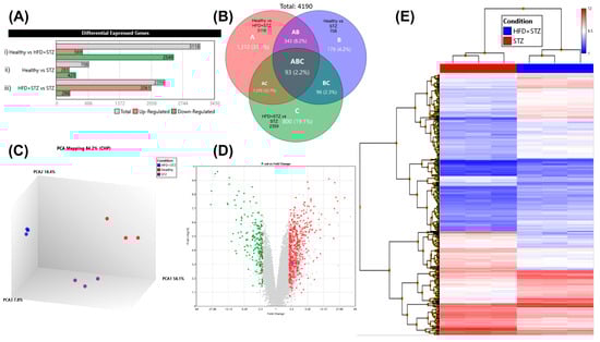 Primary analysis provided by TAC. A summary of the genes that were upregulated and downregulated in the experimental groups. (A) Differentially expressed genes (DEGs) after microarray analysis among healthy, HFD + STZ, and STZ groups, n = 9 animals per experimental group. (B) Venn diagram depicting the number of DEGs among the experimental groups. (C) Distribution of three biological replicates from each group evaluated by principal component analysis (PCA). (D) Volcano plot including 68,842 genes and showing the up- (red) and down- (green) regulated coding genes (E) Hierarchical clustering displayed homogeneity and reproducibility of the gene expression pattern from triplicates in HFD + STZ (blue) and STZ (red) conditions.