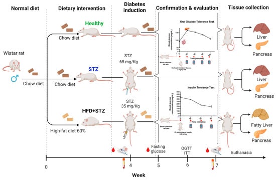 Experimental design and timeline of the diabetes induction scheme. Rats were allocated to three experimental groups, with 9 animals per group: the healthy group (animals without induction, fed with a standard chow diet), the STZ group (animals fed with a standard chow diet that received a single i.p. STZ dose (65 mg/kg BW)), and the HFD + STZ group (animals fed with an HFD for 4 weeks before a single i.p. administration of STZ at a low dose (35 mg/kg BW)). Once hyperglycemia was corroborated (fifth week), we performed an evaluation of the glucose homeostasis with insulin and oral glucose tolerance tests (ITT and OGTT, respectively) between the fifth and seventh week, with a difference of 7 days in the performance of ITT and OGTT. Abbreviations: STZ, streptozotocin; HFD, high-fat diet; i.p., intraperitoneal; BW, body weight.