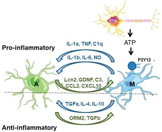- Jha, M.K.; Jo, M.; Kim, J.H.; Suk, K. Microglia-astrocyte crosstalk: An intimate molecular conversation. Neuroscientist 2019, 25, 227–240. [Google Scholar] [CrossRef]
