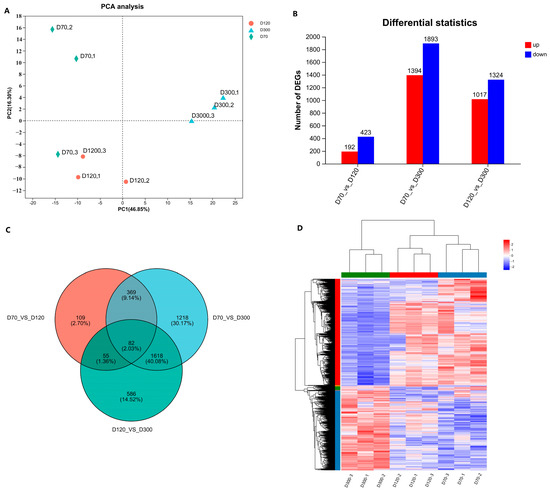 At the transcriptome level, 615, 3287, and 2341 DEGs were identified in the comparisons of D70-vs.-D120, D120-vs.-D300, and D70-vs.-D300, respectively. KEGG enrichment analysis of DEGs revealed significant enrichment of signaling pathways such as MAPK, cAMP, PI3K-Akt, ECM–receptor interaction, and PPAR in the D70-vs.-D120 comparison group. In the D120-vs.-D300 and D70-vs.-D300 comparison groups, some genes were enriched in common pathways, including NF-kappa B, CAMs, Th1 and Th2 cell differentiation, and cytokine–cytokine receptor interaction, which were significantly enriched in all three comparison groups.