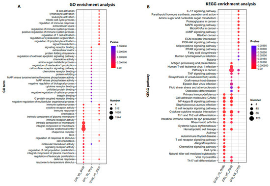 To explore the biological functions affecting the growth and development of the Yangzhou goose knob, Gene Ontology (GO) functional analysis and Kyoto Encyclopedia of Genes and Genomes (KEGG) pathway analysis were conducted on the 6243 DEGs. In the Biological Process (BP) category, DEGs were primarily associated with immune response, cell chemotaxis, and skin morphogenesis. In the Cellular Component (CC) category, DEGs were mainly related to the extracellular space, integral components of the membrane, and intrinsic components of the membrane. In the Molecular Function (MF) category, the DEGs were predominantly associated with immune and cytokine receptor activity (Figure S3 and Table S4). DEGs were significantly enriched in signaling pathways, such as TNF, MAPK, cAMP, PI3K-Akt, ECM–receptor interaction, NF-kappa B, and PPAR (Figure S4 and Table S4). It is worth noting that previous studies have also observed significant enrichment in pathways like PI3K-Akt, PPAR, ECM–receptor interaction, cytokine–cytokine receptor interaction, and cAMP, indicating the crucial roles of these pathways in the growth and development of goose knob [16,17]. To further elucidate the functions of the DEGs, GO (mainly focusing on BP terms) and KEGG pathway enrichment were performed on the adjacent control groups (Figure 3A,B, Table S5). For D70-vs.-D120, significant enrichment was observed in terms of signaling receptor binding, the extracellular matrix, the protein folding chaperone, the regulation of epidermal development, skin morphogenesis, the BMP signaling pathway, the establishment of a skin barrier, and other terms related to skin development. GO terms for D70-vs.-D300 include the immune system process, the intrinsic component of the membrane, and the integral component of the membrane. D120-vs.-D300 is mainly enriched in B cell activation, lymphocyte activation, leukocyte activation, and terms related to skin and keratinocyte differentiation, such as skin morphogenesis and mesenchymal-epithelial cell signaling. In summary, DEGs on D70-vs.-D120 enrich in multiple terms related to epidermal development, suggesting a direct association with skin growth and development. DEGs in D70-vs.-D300 are related to the immune response and membrane composition. D120-vs.-D300 mainly enriches cell activation. The MAPK, cAMP, ECM–receptor interaction, PI3K-Akt, and PPAR signaling pathways were predominantly enriched in all three control groups.