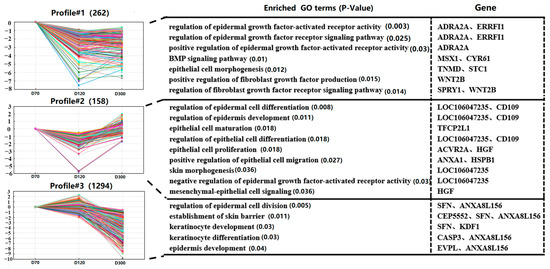 In gene cluster 1, we found that genes are enriched in the regulation of epidermal growth factor-activated receptor activity (ADRA2A, ERRFI1), the regulation of the epidermal growth factor receptor signaling pathway (ADRA2A, ERRFI1), the positive regulation of epidermal growth factor-activated receptor activity (ADRA2A), the positive regulation of the BMP signaling pathway (MSX1, CYR61), the epithelial cell morphogenesis (TNMD, STC1), the positive regulation of fibroblast growth factor production (WNT2B), and the regulation of fibroblast growth factor receptor signaling pathways (SPRY1, WNT2B). Gene expression in this cluster was the highest at D70. We also observed that genes in gene cluster 2 are associated with the regulation of epidermal cell differentiation (LOC106047235, CD109), the regulation of epidermis development (LOC106047235, CD109), epithelial cell maturation (TFCP2L1), the regulation of epithelial cell differentiation (LOC106047235, CD109), epithelial cell proliferation (ACVR2A, HGF), the positive regulation of epithelial cell migration (ANXA1, HSPB1), skin morphogenesis (LOC106047235), the negative regulation of epidermal growth factor-activated receptor activity (LOC106047235), and mesenchymal-epithelial cell signaling (HGF). Gene expression in this cluster reached its lowest level on D120.
