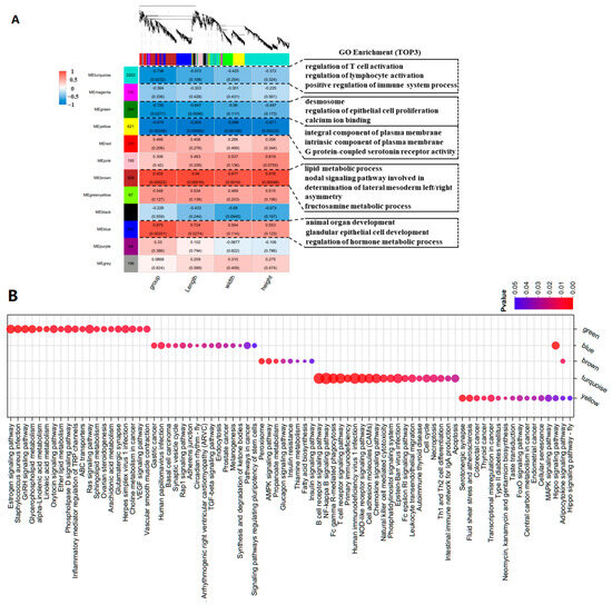 WGCNA analysis. (A) Division of gene modules and correlation between gene modules and sample information. The figure shows the clustering of genes, the division of gene modules, and the correlation between gene modules and module information, as well as the GO enrichment (top 3) analysis of modules. (B) KEGG functional analysis of key modules. Note: In Figure 6A group (D70, D120, D300), Length represents goose knob height, Width indicates goose knob width, and Height corresponds to goose knob height.