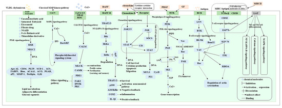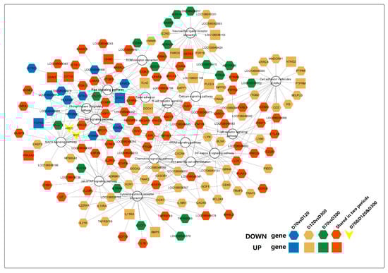 By systematically examining the enrichment status of DEGs’ pathways (Table S10), we identified a total of 17 potential signaling pathways involved in goose sarcoma development, with 167 genes incorporated into the pathway network diagram (Figure 7). Among these, the correlation coefficients of these 167 genes in WGCNA analysis were all greater than or equal to 0.9. From the diagram, it can be observed that all 17 signaling pathways were expressed in D70-vs.-D120, D70-vs.-D300, and D120-vs.-D300. However, only two genes (AREG and MYC) were expressed in all three time periods (D70, D120, and D300). Interestingly, these two genes are involved in connecting the MAPK- and PI3K-AKT signaling pathways. DEGs uniquely expressed in D70 versus D300 mainly converged in the Ras, MAPK, and Phospholipase D signaling pathways, whereas DEGs uniquely expressed in D120 versus D300 were primarily enriched in the CAMs, PPAR, calcium, neuroactive ligand–receptor interaction, cytokine–cytokine receptor interaction, Th1 and Th2, and NF-kappa B signaling pathways. Genes uniquely expressed at D70 versus D120 were mainly enriched in neuroactive ligand–receptor interactions and neuroactive ligand–receptor interactions that connect the calcium signaling pathway. In conclusion, we found that neuroactive ligand–receptor interactions and calcium signaling pathways play major roles in promoting the occurrence of goose squamous cell carcinoma. NF-kappa B, CAMs, and Th1 and Th2 play crucial roles in processes such as the proliferation and differentiation of goose squamous cell carcinoma epidermal cells. Additionally, the B cell receptor, PI3K-Akt, Focal adhesion, and JAK-STAT signaling pathways are involved in various processes of goose squamous cell carcinoma formation, epidermal cell proliferation, and differentiation.