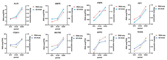 To verify the accuracy of the KEGG pathway and experimental data, we selected four genes in the pathway related to goose knobs (BMP5, IGF1, ITGA11, NPPC) and randomly selected four DEGs (TEX36, ALX1, IGFBP4, MATN2) and examined their relative expression using RT-qPCR. The trend of the RT-qPCR results for the eight genes was consistent with that of the transcriptome analysis, confirming the reliability of the transcriptome results (Figure 8).