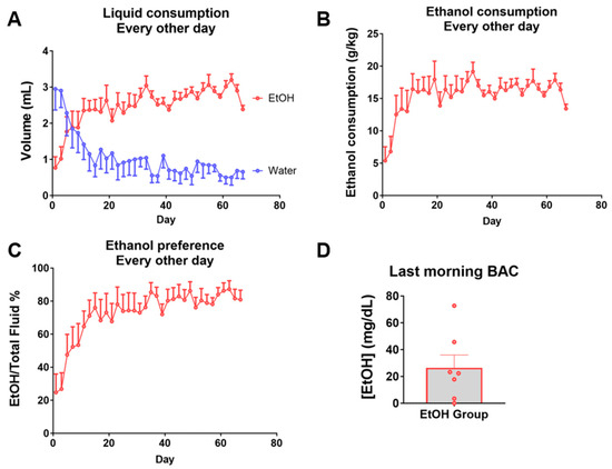Mouse model of every-other-day voluntary ethanol consumption. (A) Every-other-day ethanol and water consumption of the ethanol group, in volume. (B) Every-other-day ethanol consumption normalized by body weight. (C) Every-other-day ethanol preference of the ethanol group as percentage of total fluid consumption. (D) Blood ethanol concentration from samples obtained in the morning after the last consumption session, before euthanasia. n = 7 per group. Data are presented as mean ± SEM.
