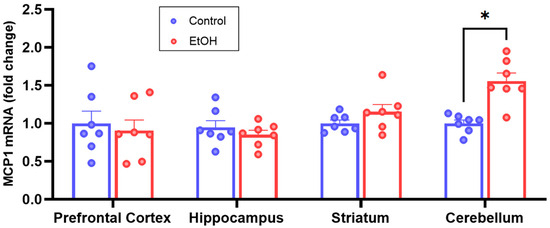 To assess ethanol-induced neuroinflammation, RNA extracted from homogenates was used for RT-qPCR analyses, and the expression of MCP1 was selected as the main neuroinflammation marker, being the most consistent cytokine found to be increased in animal models of forced ethanol exposure [18,19,20,21,22,23,24,25,26,27,28,29]. The results show that MCP1 mRNA was significantly increased in the cerebellum of ethanol-exposed mice, while no significant changes were observed in prefrontal cortex, hippocampus, or striatum compared to water-exposed controls (Figure 2).