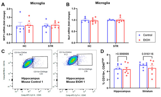 Further investigation focused on whether MCP1 alterations occurred in microglia, the main MCP1-producing cells [17], to study whether significant differences in MCP1 might be masked by the contribution of other cells in the homogenates. However, the RT-qPCR analysis of isolated microglia from the hippocampus and striatum showed no alterations in MCP1 levels between experimental groups (Figure 3A). The non-responsiveness of microglia to ethanol was further evidenced by analyzing the mRNA levels of Iba1, the cytoskeleton-related protein associated with proinflammatory activation. Indeed, no significant changes were observed in microglia isolated either from the hippocampus or the striatum (Figure 3B). In addition, a flow cytometry analysis to determine whether the percentage of CD11b+, CD45high cells, usually reported as activated microglia or infiltrating macrophages [48,49], showed no changes in the hippocampus or striatum of mice that consumed ethanol intermittently, chronically, and voluntarily compared to control animals (Figure 3C,D). Thus, cerebellum homogenates were the only brain region where neuroinflammation was observed in this study design.