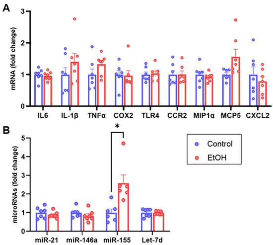 To further characterize the degree of neuroinflammation observed in the cerebellum, the mRNA levels of other proinflammatory proteins and proinflammatory (miR-155 [50,51]) and anti-inflammatory (miR-21, miR-146a, and Let-7d [52,53]) microRNAs were measured. The mRNA levels of proinflammatory proteins interleukin 6 (IL6), cyclo-oxygenase 2 (COX2), and Toll-like receptor 4 (TLR4), and of chemokines MIP1α, MCP5, and CXCL2 and the chemokine receptor CCR2, were unchanged (Figure 4A). Interestingly, the levels of the proinflammatory miRNA miR-155 were increased in the cerebellum of mice that consumed ethanol compared to controls, while no changes in the selected anti-inflammatory microRNAs were observed (Figure 4B). An increase in miR-155 levels has been previously reported in the cerebellum of mice exposed to ethanol as the sole source of food compared to pair-fed mice [19].