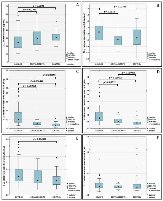 Statistical analysis was performed using the Statistica 13.3PL software package (StatSoft Inc., Tulsa, OK, USA). Shapiro–Wilk’s test was used to analyze the normality of all examined parameter distributions. Due to the lack of confirmation of a normal distribution for results obtained, nonparametric tests were used. Values of CLU concentrations and relative reactivities of CLU glycans with specific lectins were presented as mean ± SD (SD—standard deviation) and interquartile range (Q1–Q3)—see Table 1 as well as the graphs showing median values (Figure 1) The ANOVA test was used to compare CLU concentration values and relative reactivities of CLU glycans with lectins between analyzed groups of participants. The correlations between examined parameters with a 95% confidence interval were estimated according to the Spearman rank test. A two-tailed p-value of less than 0.05 was considered significant. The utility of lectins’ relative reactivities with CLU glycans and CLU concentrations for COVID-19 diagnostics was analyzed using receiver operating characteristic (ROC) curves. Based on the AUC (area under the curve) measurement, the clinical value of laboratory tests can be defined as zero (0–0.5), limited (0.5–0.7), moderate (0.7–0.9), and high (>0.9) [19]. The Youden index method was used for the determination of cut-off points. The p-values (probability values) less than 0.05 were considered significant.