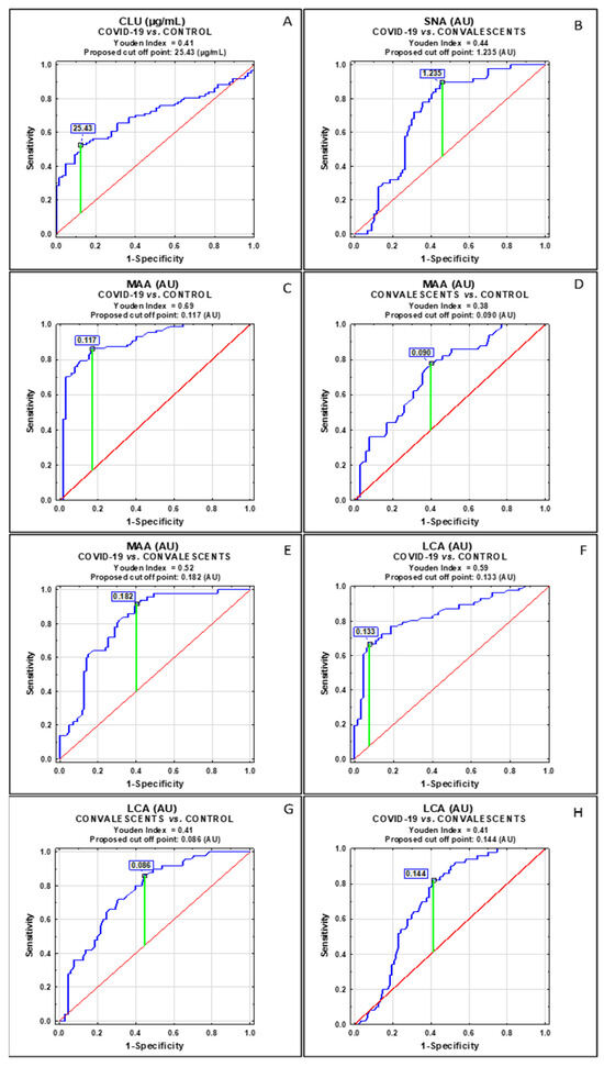 ROC curve analysis for clusterin concentrations (A) and relative reactivities of CLU glycans with lectins (B–H). Only the parameters for which the values of area under the curve (AUC) were ≥0.704 (moderate and high clinical value) were presented. For the determination of cut-off points, the Youden index method was used. The reference line is marked in red, the receiver operating characteristics for analyzed parameter in blue, and the cut-off point in green. CLU—blood serum clusterin concentrations; SNA—CLU glycan relative reactivity with Sambucus nigra agglutinin; MAA—CLU glycan relative reactivity with Maackia amurensis agglutinin; LCA—CLU glycan relative reactivity with Lens culinaris agglutinin. Significant differences were accepted for a p-value (probability value) of less than 0.05. The exact specificity of the lectins used can be found in Section 4.4.