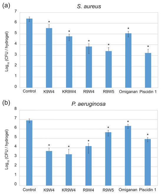 Colony forming units (CFU) observed on the hydrogel surfaces functionalized with six different AMPs as well as a control hydrogel surface. In (a) the CFU of S. aureus is presented and in (b) the CFU of P. aeruginosa is presented. The data presented are the average of three runs performed in triplicates (n = 9) and is shown in log10. The error bars show the standard deviation and * indicates a statistically significant reduction compared to the control, p < 0.05.