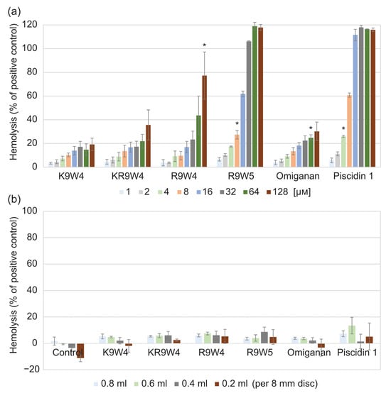 Hemolysis of 1 vol% defibrinated horse blood compared to the positive control (0.1% Triton X-100). (a) hemolysis from the free AMPs at different concentrations ranging from 1 µm to 128 µm. Each bar is the average of three runs and the error bars are the standard deviation. (b) hemolysis of control hydrogels without any AMPs (noted as control in graph), and hydrogels functionalized by the six different AMPs. The hydrogel discs of the same size were placed in different volumes of the blood solution, 0.2 mL to 0.8 mL. Each bar is the average of three runs performed in duplicates, n = 6. * indicates the concentration in which the hemolysis was statistically significantly higher than the set threshold at 20% hemolysis, p < 0.05.