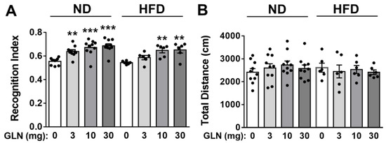 In our current studies in ND or HFD animals, regardless of gender, the index of learning and memory functions was significantly higher in the GLN treatment group than in the control (Figure 1, Supplementary Figure S2). Notably, the total exploring time and movement distance did not display significant differences between the GLN-treated and control groups (Figure 1, Supplementary Figure S2), indicating that GLN did not affect motor ability. While it is well known that obesity impairs learning and memory functions in both humans and mice [50,51], interestingly, our studies did not reveal a significant reduction in learning and memory functions due to HFD (Figure 1). This observation might be attributed to the relatively short duration of the HFD in our study (10 weeks), whereas cognitive impairment induced by obesity in mice typically requires a longer duration (approximately 20–40 weeks) of the HFD regimen [10]. Interestingly, cognitive deficits have been observed in animals subjected to shorter durations of HFD treatment. For instance, a study conducted on male rats (120–150 g) exposed to an HFD (SDS 824053; kcal composition: 45% fat, 20% protein, 35% carbohydrate) for 10 weeks demonstrated cognitive impairment [52]. Similarly, another study utilizing male mice of the same strain (aged 4–5 weeks) and HFD (Research Diets D12492: 60% fat, 20% protein, 20% carbohydrate), as in our current study, found that compared with the ND and low-fat diet (LFD) animals, cognitive function was impaired after just 1 week of the HFD; however, it returned to levels comparable to those in LFD mice after 6 weeks of the HFD [53]. In our study, 8-week-old mice were fed with an HFD for 10 weeks before undergoing an NORT. The discrepancies between our study and these reports may be attributed to differences in species and ages during the HFD exposure.