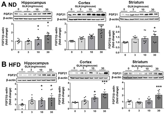 GLN’s induction of FGF21 expression in the hippocampus, cortex, and striatum. After two weeks of GLN injection, the protein levels of FGF21 were measured in the hippocampus, cortex, and striatum of ND (A) or HFD mice (B) using Western blotting with β-actin as an internal control. The results represent the means ± S.E.M. (n = 8). * p < 0.05 and *** p < 0.001 compared with the GLN 0 mg/mouse group.