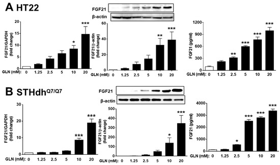 GLN-induced expression of FGF21 in hippocampal and striatal cells. HT22 hippocampal (A) and STHdhQ7/Q7 striatal cells (B) were treated with GLN (0, 1.25, 2.5, 5, 10, 20 mM) for 6 h for mRNA determination or 24 h for protein measurement. FGF21 mRNA was quantified using real-time PCR with GAPDH as an internal control, while FGF21 protein was examined through Western blotting with β-actin as an internal control. FGF21 production in the cultured medium was assessed with ELISA. The results represent the means ± S.E.M. (n = 4). * p < 0.05, ** p < 0.01, and *** p < 0.001 compared with the GLN 0 mM group.