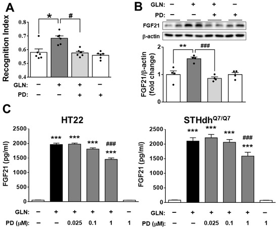 Attenuation of GLN-enhanced learning and memory functions and FGF21 production through FGFR1 inhibition in the hippocampus, hippocampal cells, and striatal cells. The ND-fed mice were administrated GLN (0, 30 mg/mouse) alone or in combination with PD173074 (2 mg/kg) through IP injection for 2 weeks, followed by the NORT (A). The FGF21 protein levels in the hippocampus (B) and in HT22 or STHdhQ7/Q7 cells treated with GLN (20 mM) alone or in combination with PD173074 (0.025, 0.1, 1 μM) for 24 h (C) were determined through Western blotting or ELISA. The results represent the means ± S.E.M. from 6 animals (A) or 4 animals (B) in each treatment group or from 4 independent experiments (C). * p < 0.05, ** p < 0.01, and *** p < 0.001 compared with the GLN 0 mg/mouse group or the GLN 0 mM group. # p < 0.05 and ### p < 0.001 compared with the GLN 30 mg/mouse or the GLN 20 mM only group.