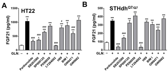Illustration of the potential involvement of signaling molecules in GLN-mediated FGF21 production in hippocampal and striatal cells. (A) HT22 cells or (B) STHdhQ7/Q7 cells were pretreated with specific inhibitors targeting NF-κB (Parthenolide, 5 µM), MAPK p38 (SB203580, 20 µM), JNK (SP600125, 20 µM), ERK (PD98059, 20 µM), Akt (LY294002, 10 μM), PKA (H89, 5 µM), PKC (Bisindolylmaleimide, BIMI, 5 µM), PPARα (GW6471, 10 µM), or PPARγ (GW9662, 10 µM) for 1 h before the addition of GLN (20 mM) for an additional 24 h. The FGF21 concentration in the cultured medium was quantified using ELISA. The results represent the means ± S.E.M. (n = 4). * p < 0.05 and *** p < 0.001 compared with the 0 mM group. # p < 0.05 and ### p < 0.001 compared with the GLN 20 mM group.